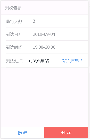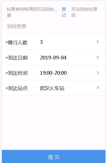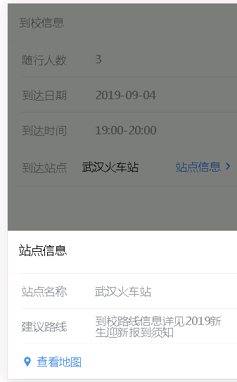 14.点击“到站登记”,点击修改可录入随行人数,到达日期,到达时间,选择到达站点,点击站点信息可查看从该站点的到校路线信息,点击提交,如下图所示
