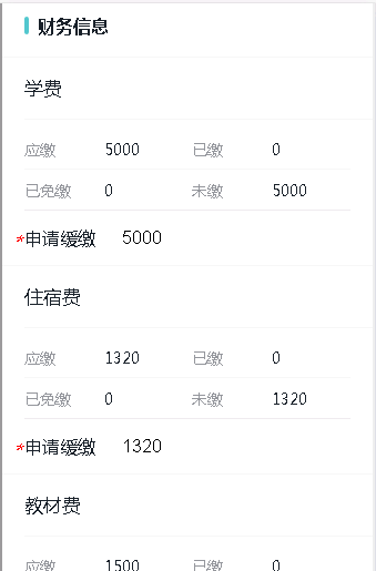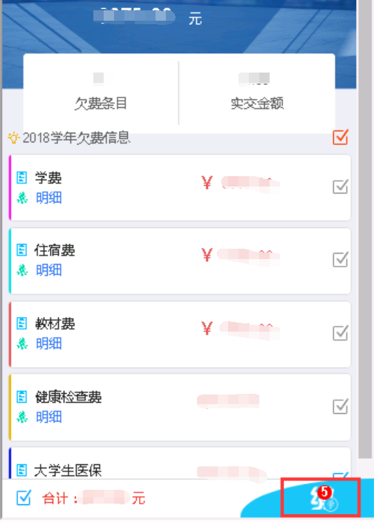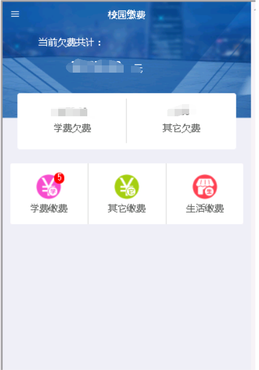 13.点击“财务缴费”,可以看到自己当前总欠费数,点击学费缴费可以展开缴费项目信息,点击页面右下方的“缴”可跳转到缴费平台界面,选择微信支付或农行扣款,如下图