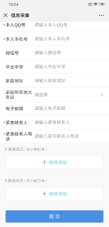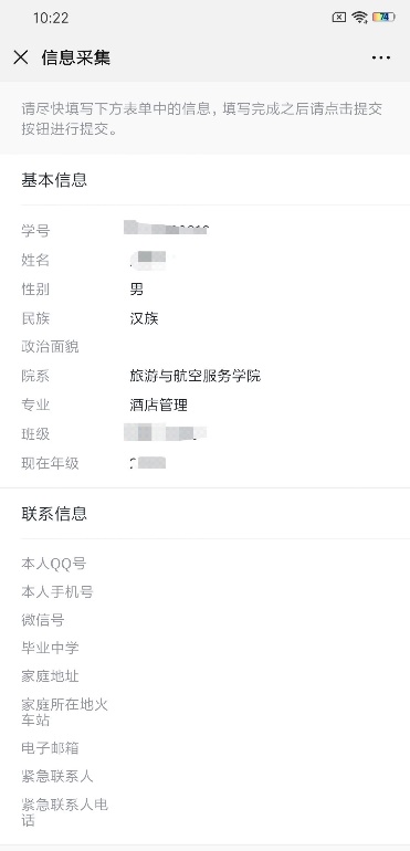 9.点击“信息采集”,可进入学生详细信息界面,包括学生基本信息、联系信息、家庭成员信息、教育经历信息等,点击最下方的修改信息按钮完善个人信息,最后点击提交按钮提交信息,如下图