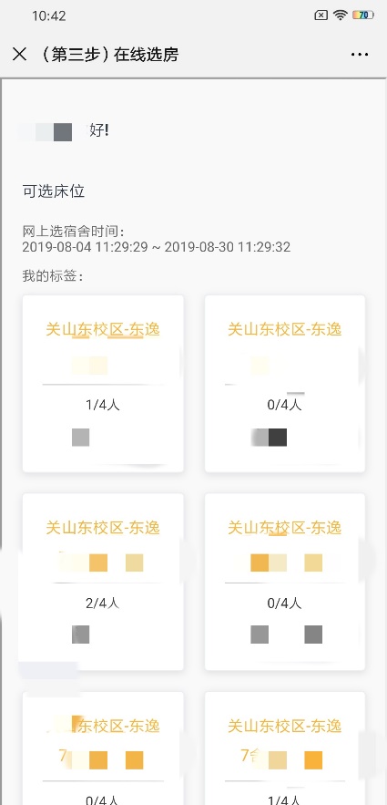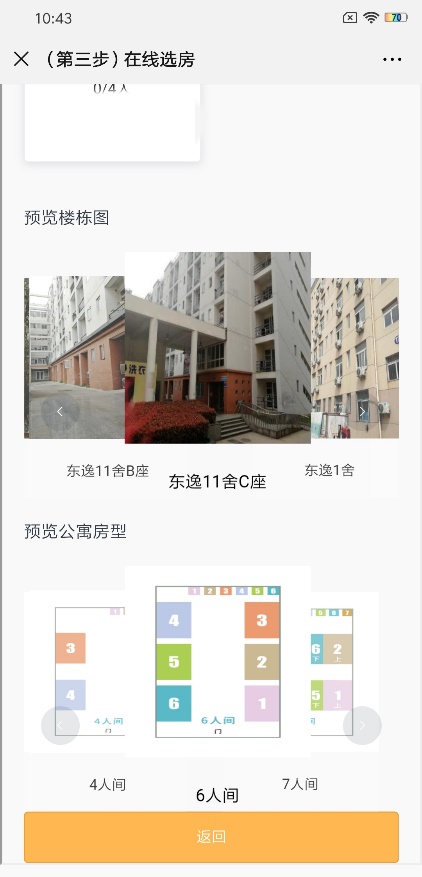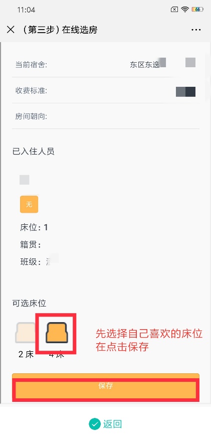 12.点击“在线选房”,学生可以预览房源,在可选床位下可以看到自己可以选择的房间信息,包括宿舍楼,房间,房间人数,已住人数,收费标准,学生选择房间后选择一个床位,点击提交,如下图(在线选房完成请于三分钟后进入财务缴费服务,并于30分钟之内完成缴费,否则房源自动释放,选房无效)