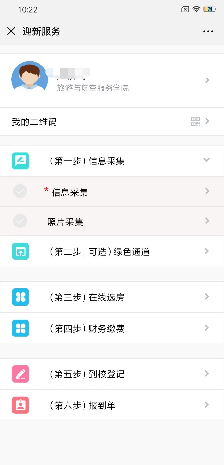 5.点击“移动迎新”应用进入到如下移动离校单页面,在离校单上会看到“信息采集”,“绿色通道”,“在线选房”,“财务缴费”,“到站登记”和“报到单”6项学生服务项目,并展示了学生的图像和基本信息内容,如下图(如有中途退出在微信里寻找“智慧武职”并点击即可到本界面)