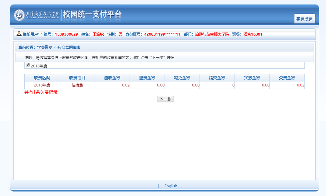 在财务缴费服务中,学生可查看自己自己当前应缴费用(见图十三),根据提示点击页面下方的“下一步”即可跳转到缴费平台(见图十四),学生可根据自身需求选择微信,支付宝和农行扣款进行缴费,缴费成功后会提示缴费成功(见图十五)。