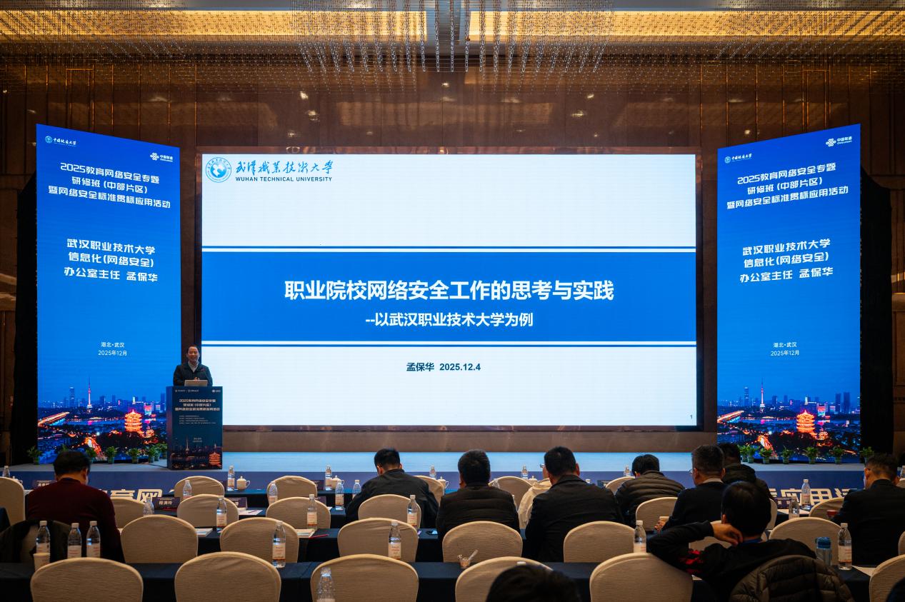 通讯员(马胜文 但祖生)近日,由教育部教育管理信息中心主办的“2025教育网络安全专题研修班(中部片区)暨网络安全标准贯标应用活动”在湖北武汉成功举办。来自中部地区各级教育行政部门、高等院校的网络安全负责人、行业代表与技术骨干齐聚一堂,共同探讨当前教育网络安全面临的挑战与对策。武汉职业技术大学信息化(网络安全)办公室主任孟保华应邀出席,并作题为《职业院校网络安全工作的思考与实践》的专题报告,系统分享了该校在网络安全领域的深入思考与创新实践,获得了与会同仁的广泛关注与好评。